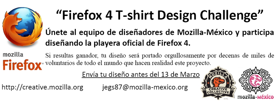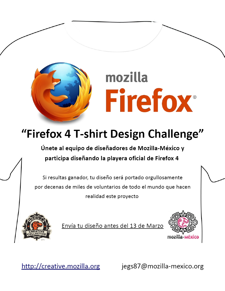Mozilla Creative Collective ha lanzado un nuevo desafio de diseño de la playera de Firefox 4, donde Mozilla-México busca diseñadores para participar y seguir colaborando, es por eso que han hecho una atenta invitación para participar y demostrar tu propio talento, basándose en los ideales de Mozilla, se busca que los artistas que colaboren con la comunidad, tengan la oportunidad de compartir su trabajo con una audiencia global.