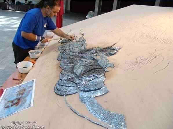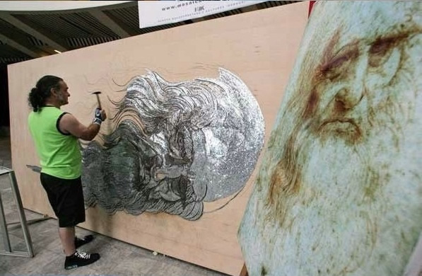Miren esta increíble obra de Arte realizada por Sajmir Strati de Albania, es un impresionante mosaico de clavos del retrato de Leonardo Da Vinci, esta fue realizada el 4 de Septiembre de 2006 y esta incluida en el libro de los records guinness como el mosaico mas grande hecho con clavos, es una obra realmente detallada les dejo una galería que muestra el proceso de creación de este mosaico de Da Vinci, en el podrán notar la tecnica y cuidado que tuvo este artista con las sombras y profundidad representada en el retrato logrando estos efectos según la profundidad con la que hayan sido insertados los clavos en la madera, espero sea de su agrado.
