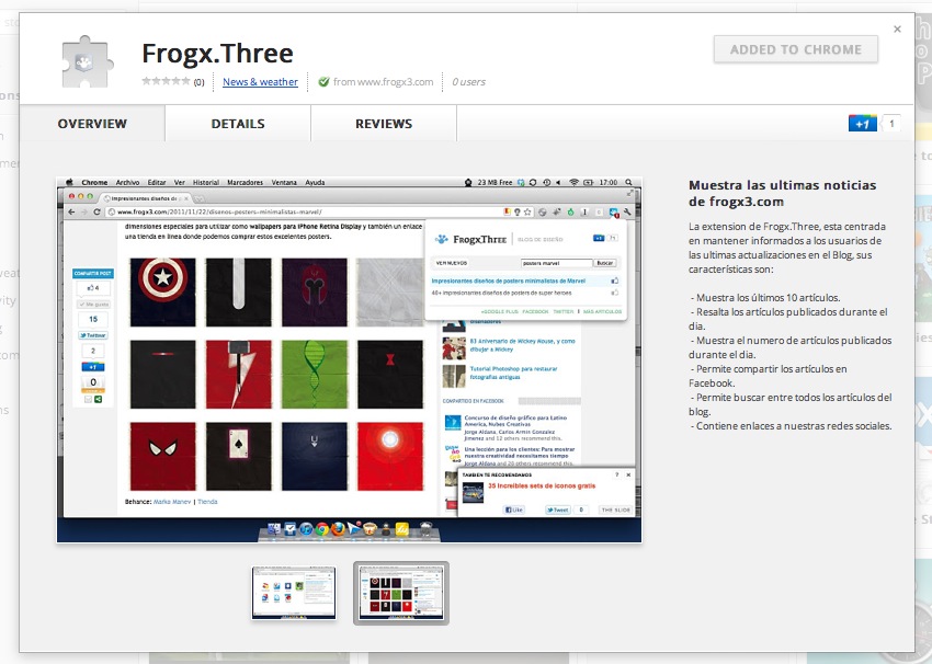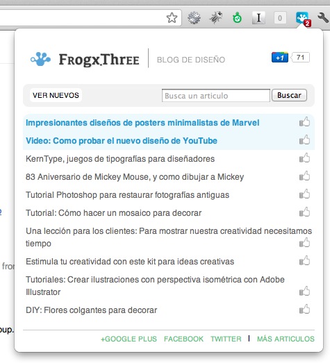 Por fin, Google nos estaba haciendo larga la espera con la publicación, pero bueno ya esta en la Chrome Store la extensión de Frogx.Three con la que podrán estar al tanto de los últimos artículos publicados en el blog y hacer búsquedas desde la misma extensión, es algo que hemos hecho para todas las #ranascreativas que diario visitan nuestro blog y de lo cual estamos muy felices.