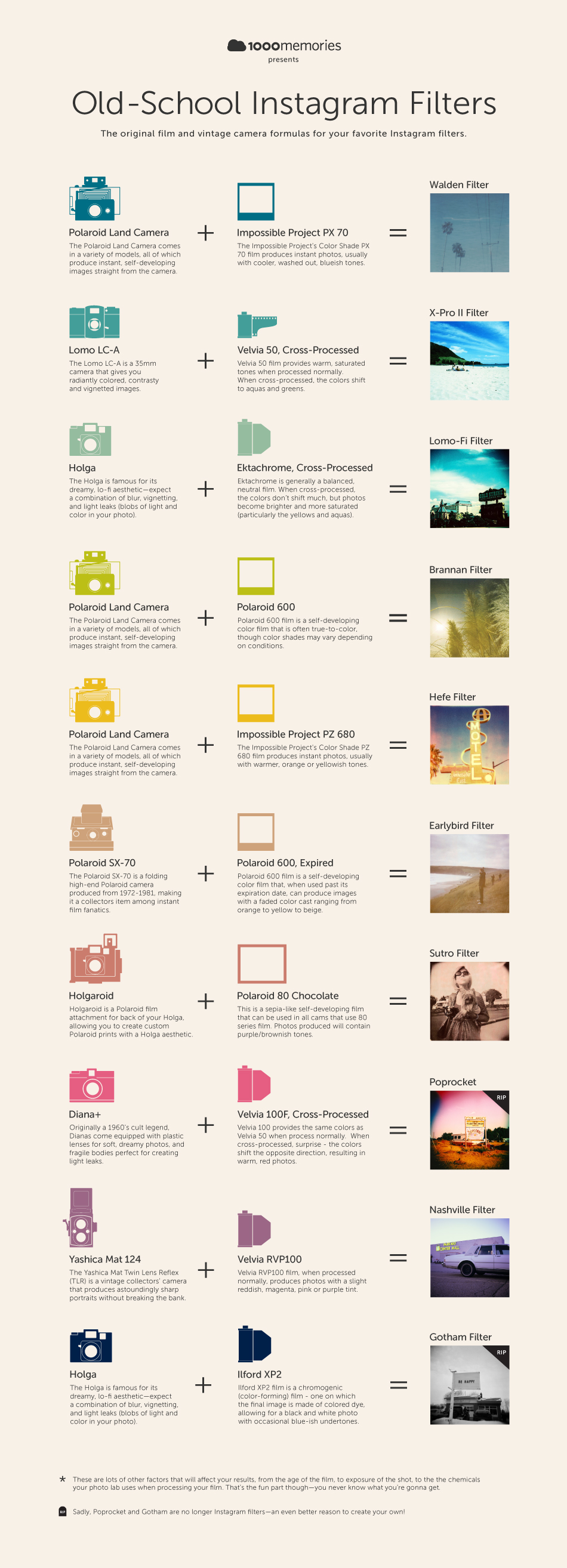 La siguiente infografia muestra la equivalencia de los filtros disponibles en Instagram con las camarás antiguas que provocaban estos efectos.