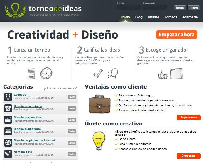 Torneo de ideas es un nuevo servicio orientado a empresas que necesitan de diseñadores y diseñadores que desean demostrar su creatividad y ampliar su portafolio mediante la competencia en torneos de diseño, el sitio tiene una dinamica muy sencilla, la empresa con necesidad de un diseño cualquiera que esta fuese lanza un torneo al cual los diseñadores envían su propuestas y la empresa elige una ganadora, logicamente el diseñador ganador recibirá un pago por su trabajo.