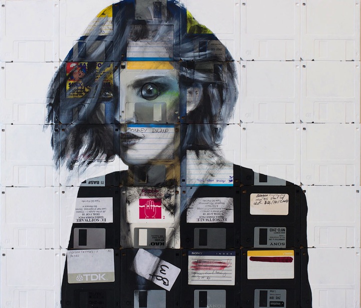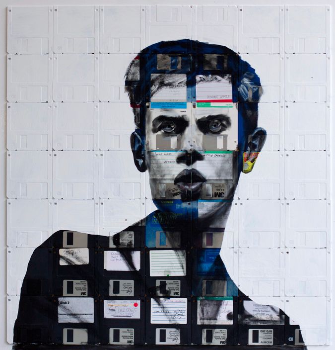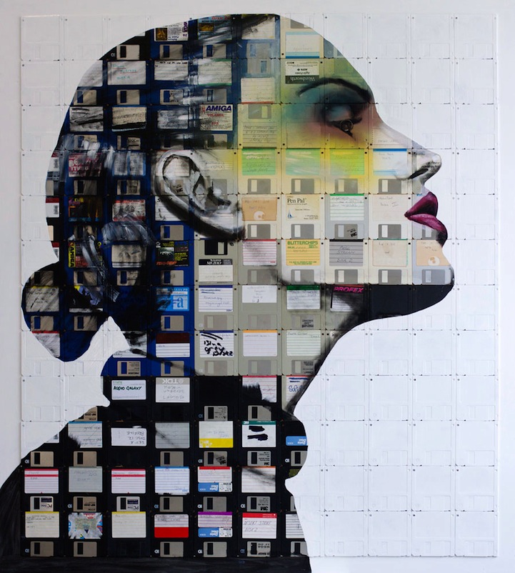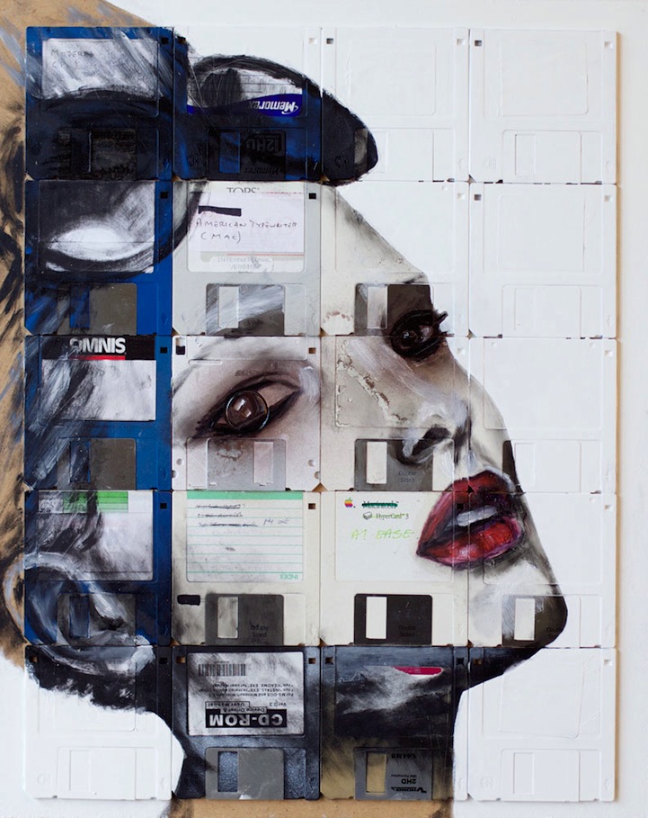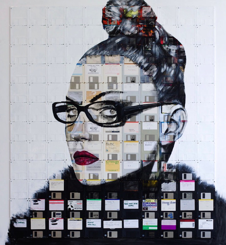 Cuantos de nosotros no utilizamos los disquetes para almacenar información, pero como la tecnología no se estanca y ahora hay nuevas formas para hacerlo podemos reutilizarlos. En esta ocasión el artista Nick Gentry encontró la manera de hacer finas obras de arte con los disquetes viejos; agrupa filas y filas de disquetes coloreadas y los usa como base para estos hermosos retratos pintados.