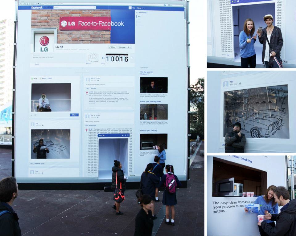 Impresionante campaña publicitaria de LG la que se monto en Nueva Zelanda gracias a la agencia Young & Rubicam, la campaña lleva el nombre de Face-to-Facebook, la campaña fue diferente a lo actual ya que se centro en invertir las tendencias actuales del Marketing hacia los medios Online, la campaña de LG Face-to-Facebook recreo el muro de la pagina de Facebook de LG al mundo real con ladrillos, actores, músicos y pintores.