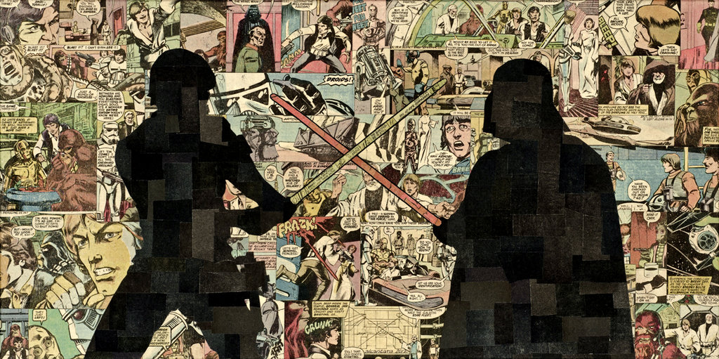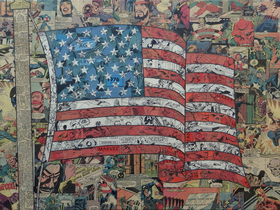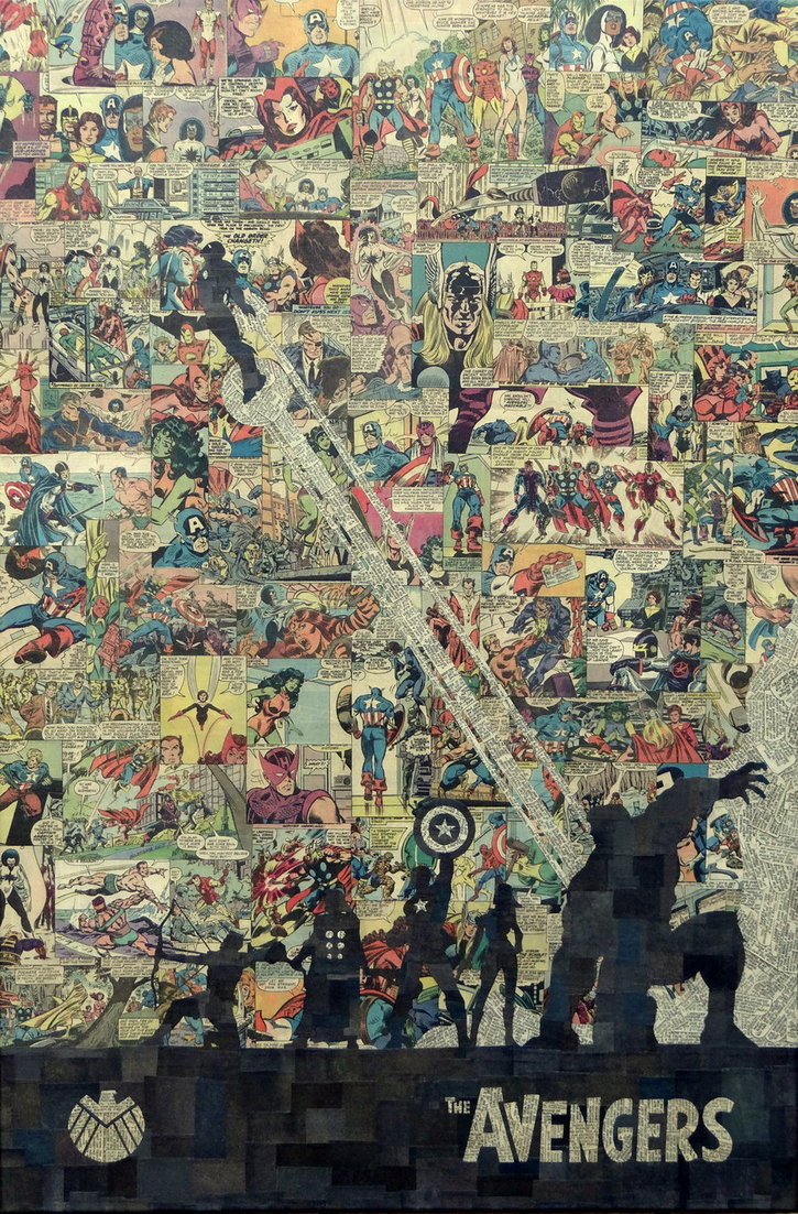 Mike Alcántara hace unos interesantes collage de superheroes sin ayuda de plumones o color de algún tipo, únicamente con los comics dándole forma a personajes, logos o insignias de estos.
