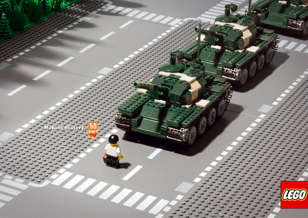 Interesante publicidad de LEGO celebrando los 50 años de existencia de la marca, la campaña lleva el nombre de “Making History: 50 years Lego“, la campaña publicitaria fue realizada por la agencia Alemana Jung von Matt/ Alster Gmbh, en ella han representando hechos históricos acontecidos los últimos 50 años utilizando piezas de LEGO.
