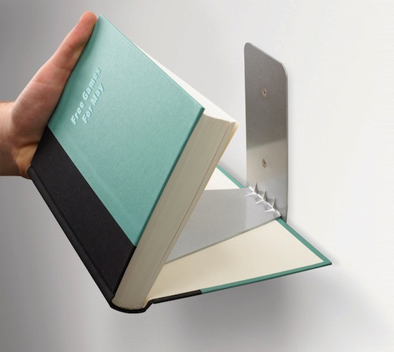 Para quienes les guste lo minimalista estos sujetadores de libros invisibles para pared serán perfectos, se trata de una pequeña paleta que va peagada a la pared y utiliza uno de los libros como soporte de los otros de tal modo que parecieran que tengamos los libros flotando en la pared.
