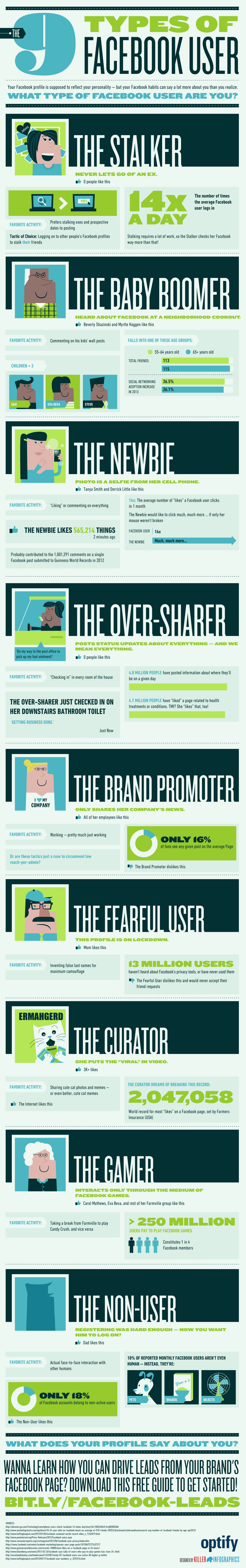 Curiosa infografía que describe los tipos de usuarios de Facebook, según esta infografía en Facebook existen un total de 9 tipos de usuario de los cuales se describen sus principales características, los tipos son: