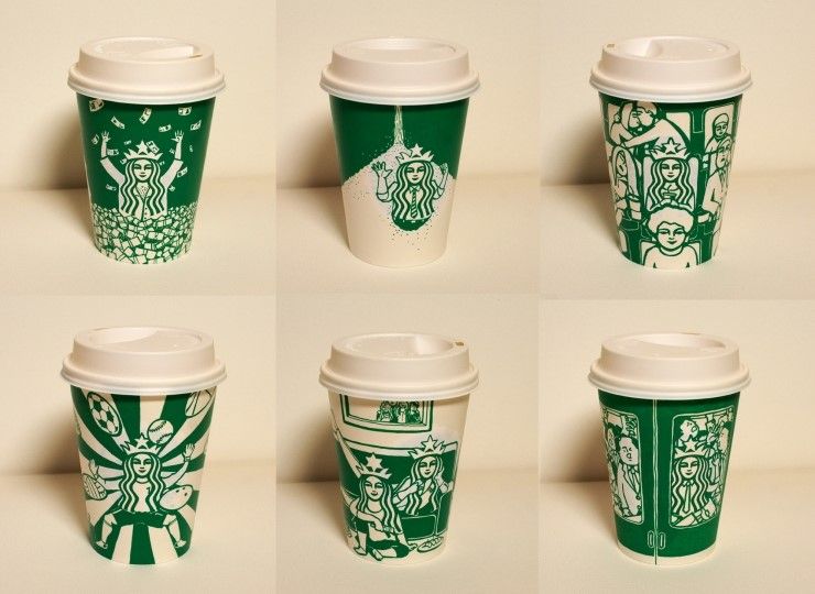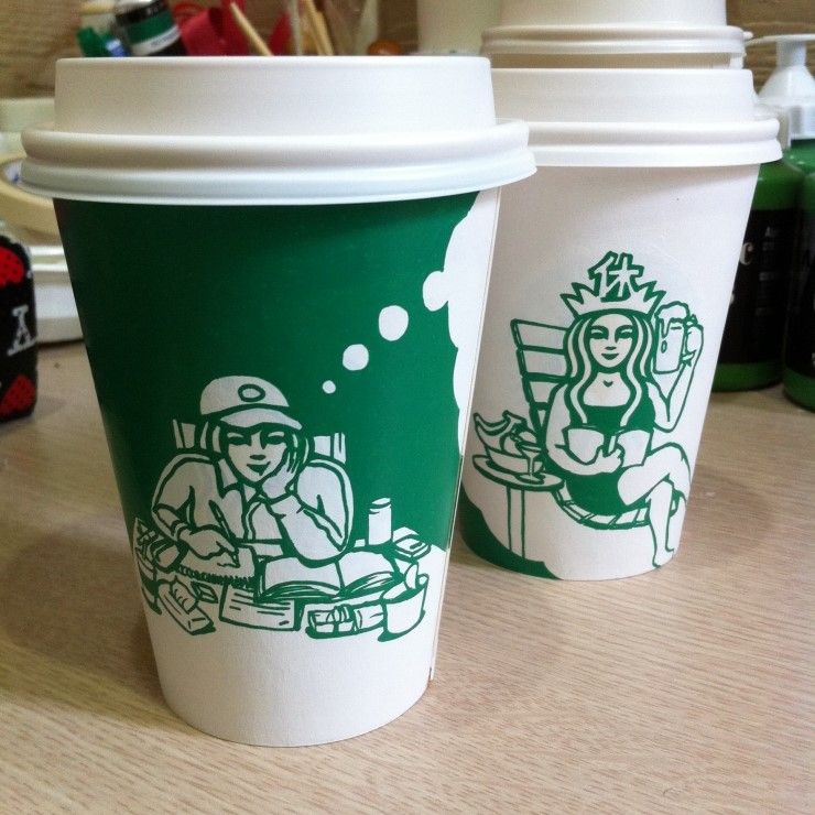 Pero hay quienes van mas haya y si que realizan verdaderas obras de arte en vasos de Starbucks, bueno no tanto pero si unos diseños bastante buenos como los que ha realizado el artista Soo Min Kim quien es originario de Corea del Sur y quien si que se inspira al beber un café de Starbucks, Soo Kim acostumbra a realizar geniales diseños en los vasos de Starbucks a partir del logo de Starbucks (la sirena coronada).