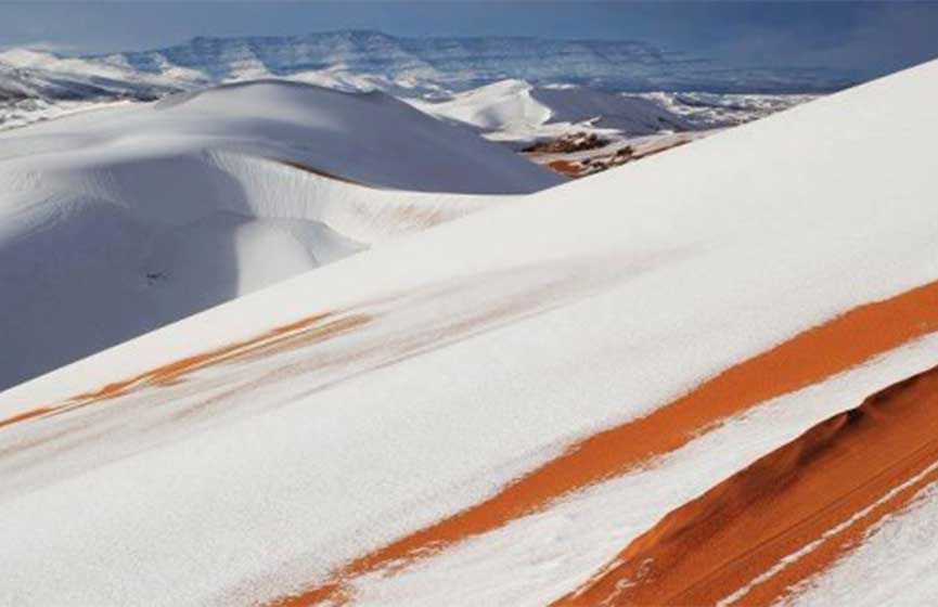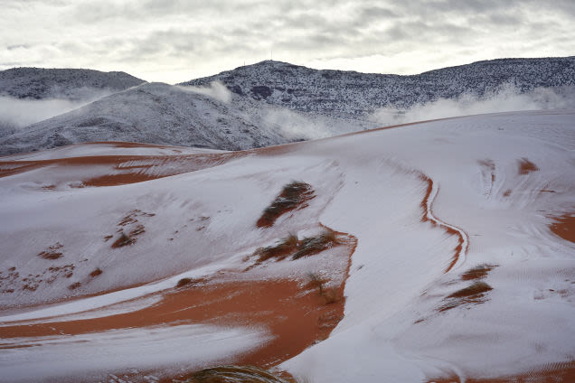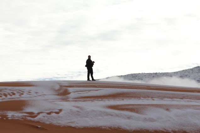 Tras la llegada de un frente frío llegado por el Mediterráneo occidental; el desierto más grande del mundo se ha teñido de blanco como parte de un espectaculo natural que es muestra de los efectos del cambio climatico debido a su frecuencia.