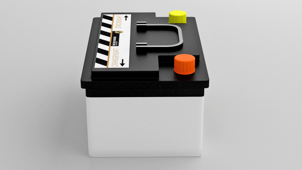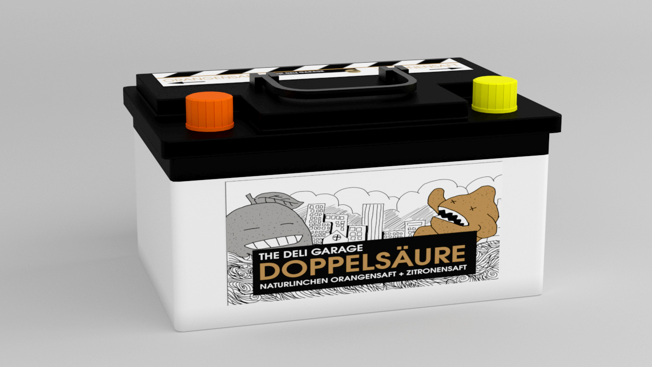 Un empaque que contiene una bebida de limón de la marca “The Deli Garage DoppelSäure” con forma de batería de auto.