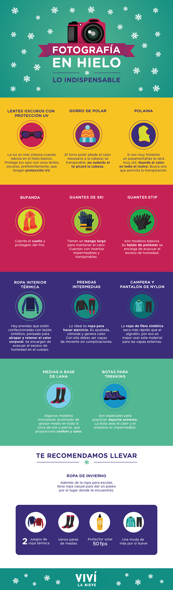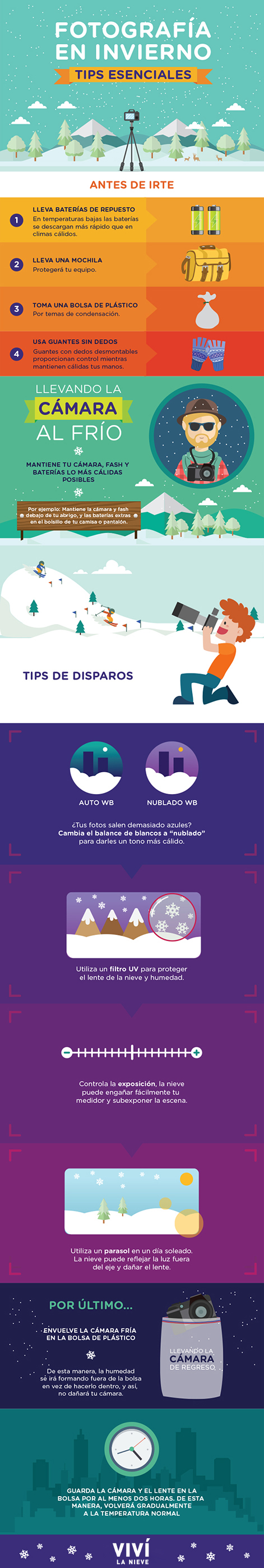 Llevar baterías extras, un filtro UV y el cuidado de la cámara; después de todo el hielo y la nieve son esencia agua, esos son algunos de los cuidados que tenemos que tener, y los cuales, están contenidos en estas infografías realizadas por el sitio web Viví la nieve.