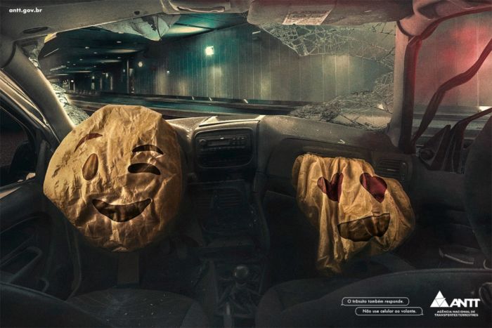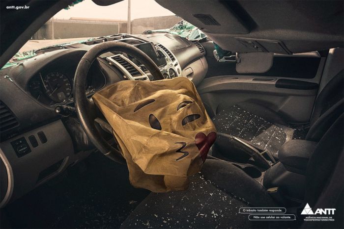Esta campaña creada por el diseñador Maxwell Junior; es una impresionante fuente de sensibilización que busca reducir los accidentes por esta causa con ayuda de la Agencia Nacional de Transportes Terrestres de Brasil bajo el titulo: “El tráfico también responde. No utilice el móvil al volante“.