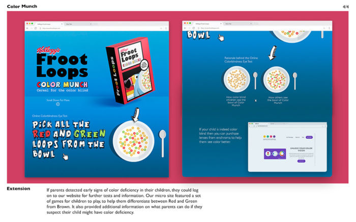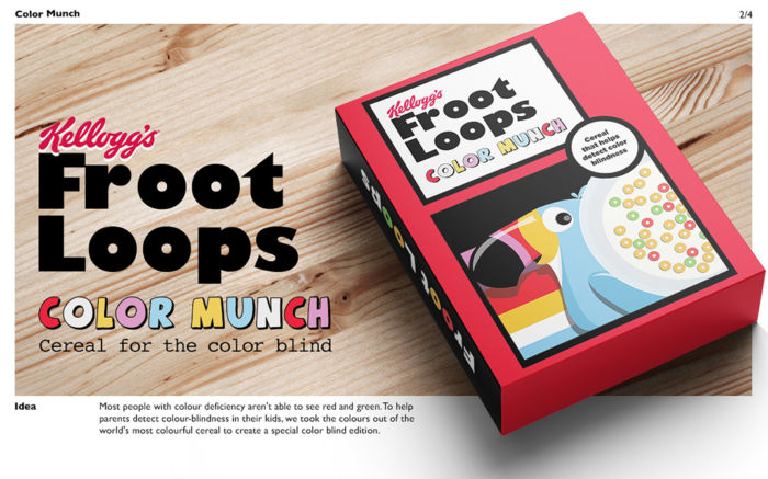 “La mayoría de las personas con deficiencia de color no pueden ver el rojo o el verde. Para ayudar a los padres a detectar el daltonismo en sus hijos, tomamos el cereal más colorido del mundo y les quitamos los colores. Mientras que la mayoría de los bucles permanecieron marrones, el resto de ellos eran rojos y verdes. Al utilizar estos dos colores y eliminar el resto, seremos capaces de detectar con precisión el daltonismo en los niños“