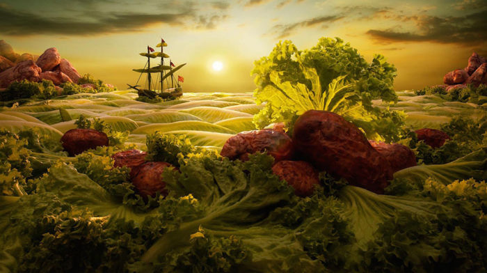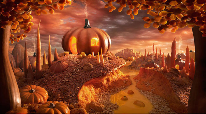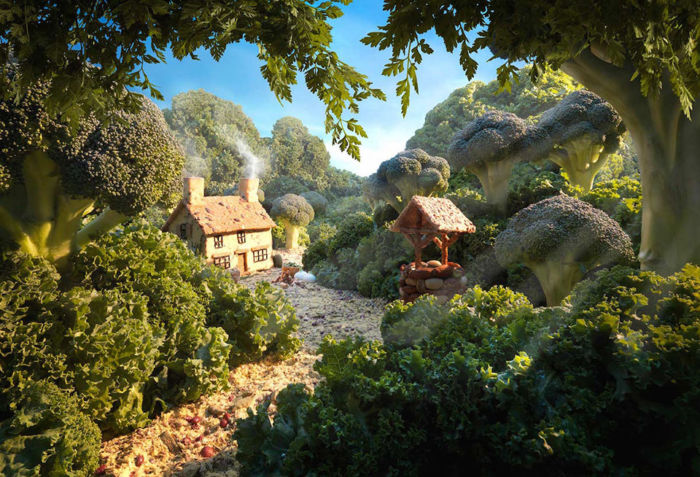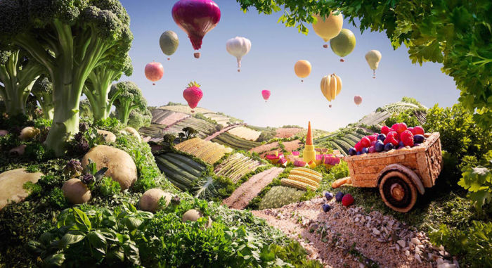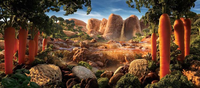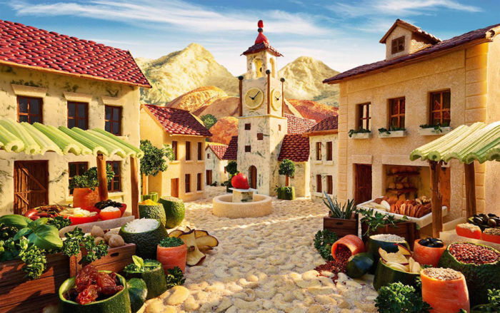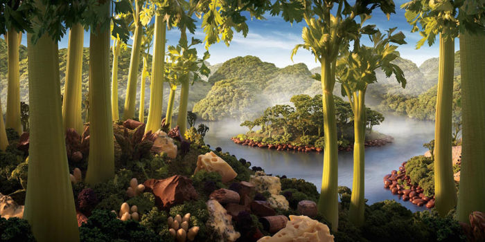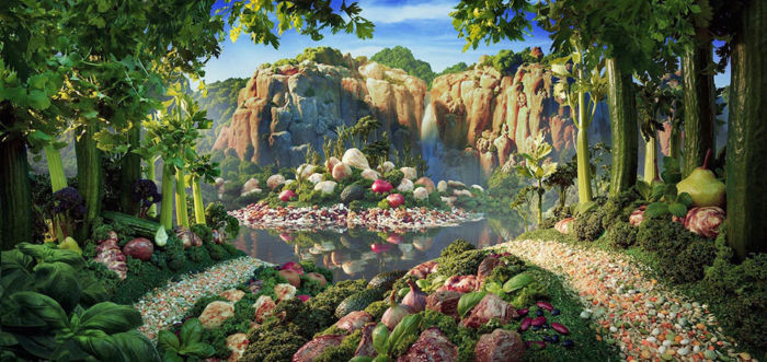 El artista señala que lo ha realizado uniendo fotografías a una por una de diversos ingredientes antes de que se descompongan por lo que estos paisajes tienen una gran cantidad de horas de trabajo que los respaldan; sin más, te dejo con los mundos comestibles de Carl Warner.
