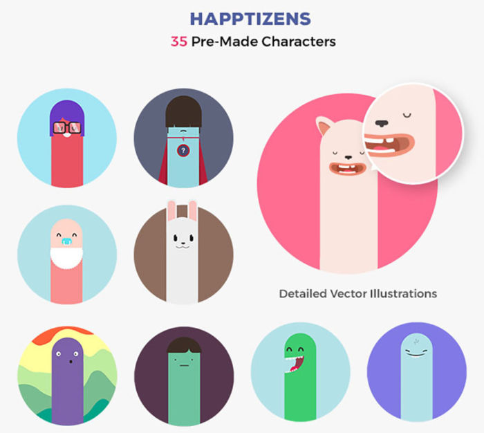 Happtizens Character es un peculiar set de ilustraciones vectoriales realizado por el diseñador y director creativo Haxon; los cuales invitan a quienes quieran descargar este set a crear sus propios personajes para sacar una sonrisa a quienes entren en sus sitos web.