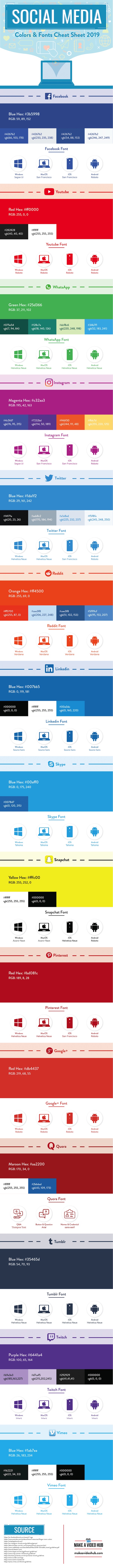 Esta infografía creada por el sitio web Make a Video Hub que ha sido actualizada el pasado 15 de noviembre muestra las últimas fuentes y colores que están utilizando las redes sociales como Facebook, Instagram, Reddit y WhatsApp.