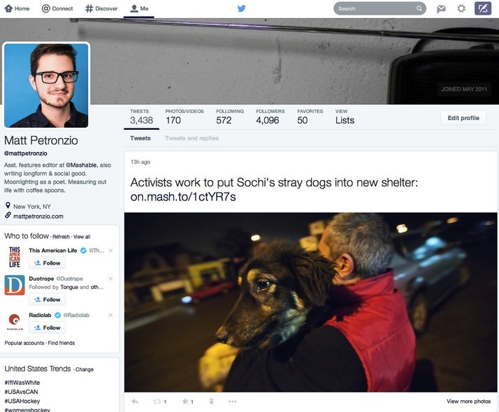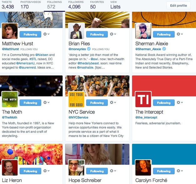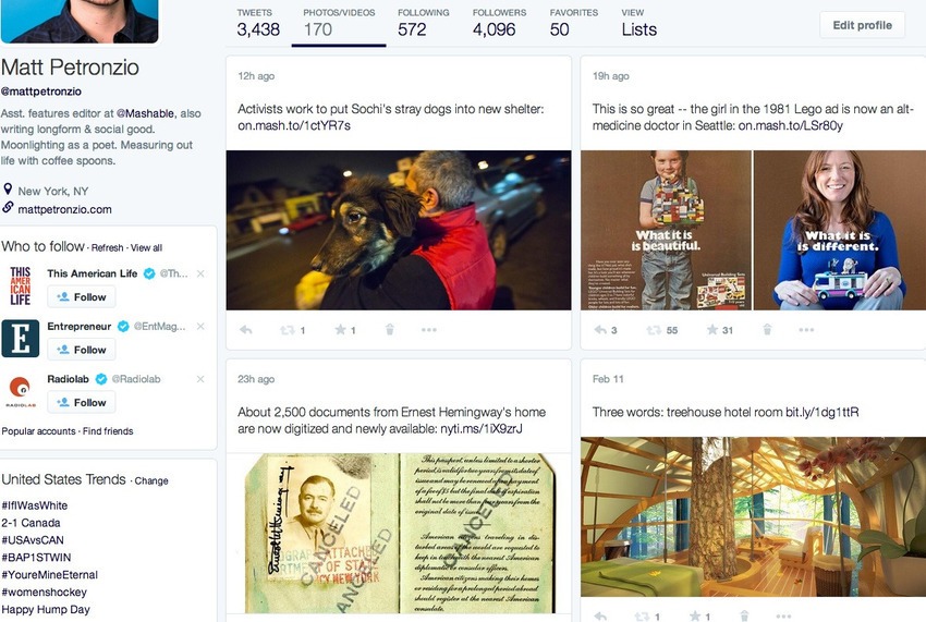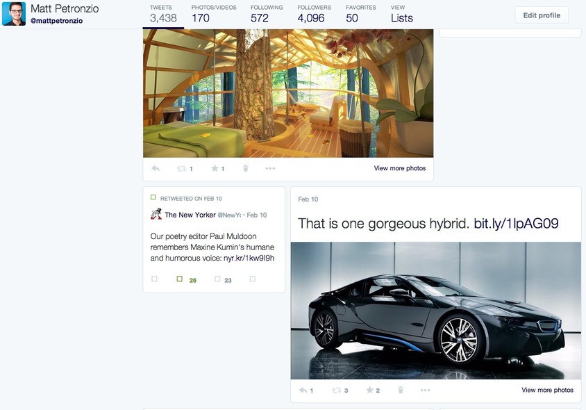 Las siguientes imágenes muestra el nuevo diseño que esta probando Twitter para lanzar este año, sin duda alguna el diseño recuerda al diseño de otras redes sociales como Facebook y Google+, en las capturas que han publicado en Mashable se muestra un rediseño completo de interfaz y de todas las secciones de Twitter, incluidas vistas para ver los Tweets con fotos y video por separado, una reestructuración de la manera en como se muestran los tweets en el timeline.