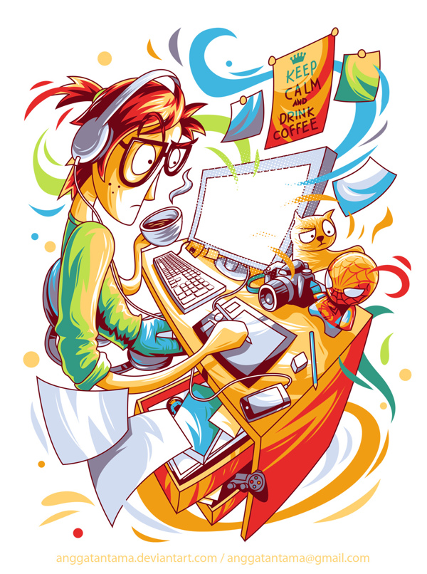 En esta galería del trabajo de Angga las dos ilustraciones que me han fascinado son la del diseñador y la del programador, me sentí completamente identificado y se de muchos que se verán en la del fotógrafo, en fin también les dejo al final la liga hacia el portafolio de Angga.