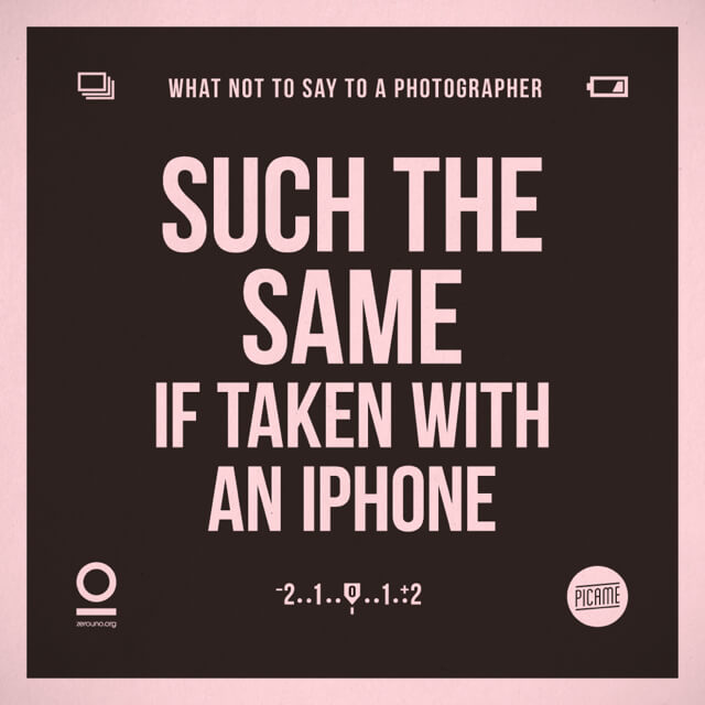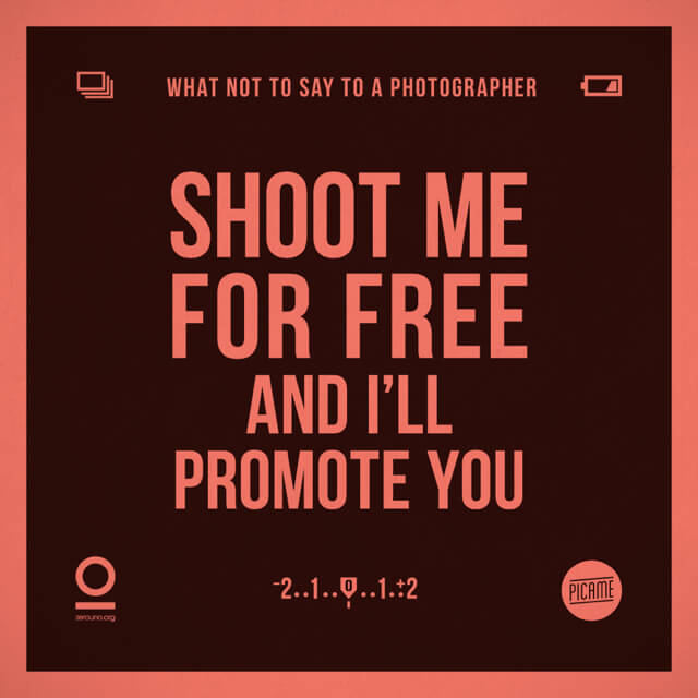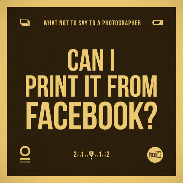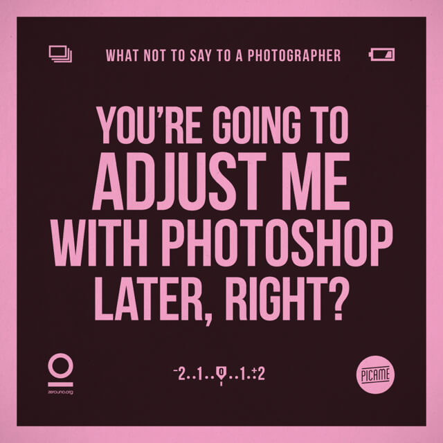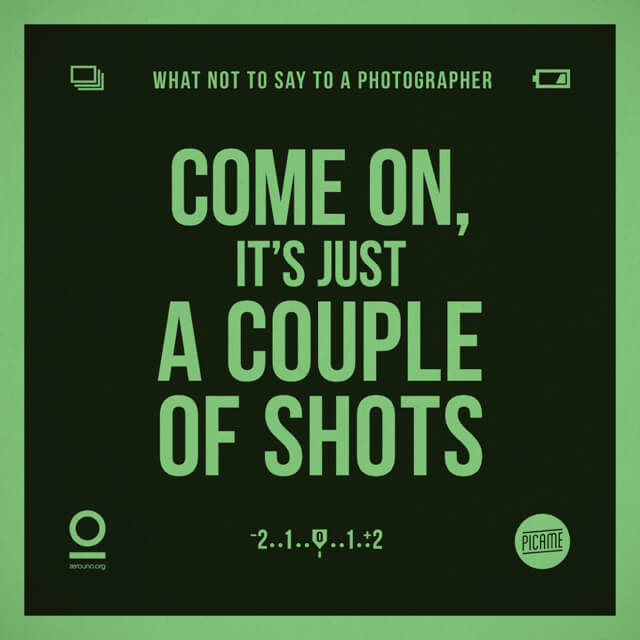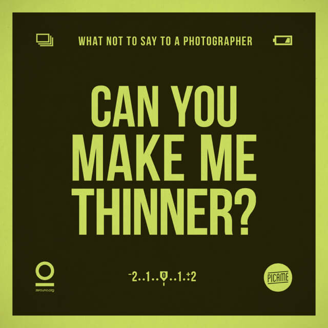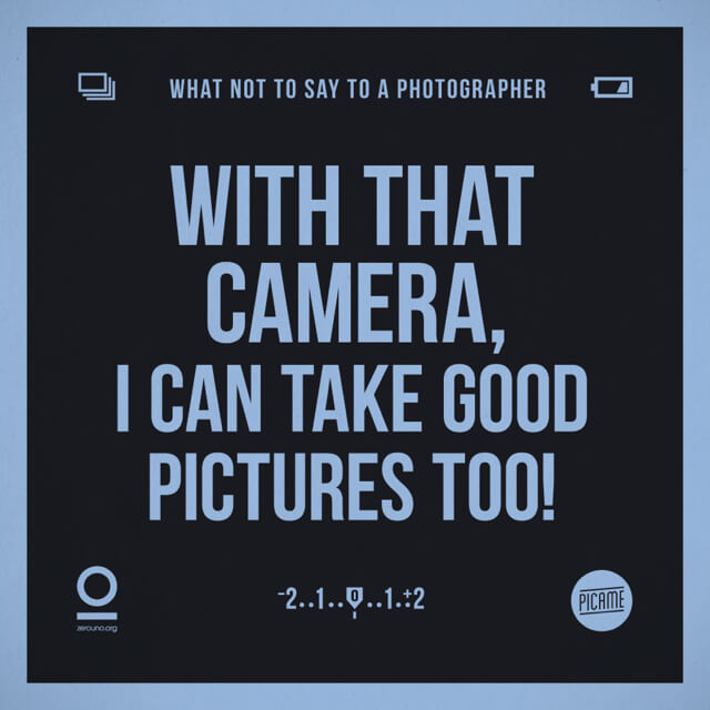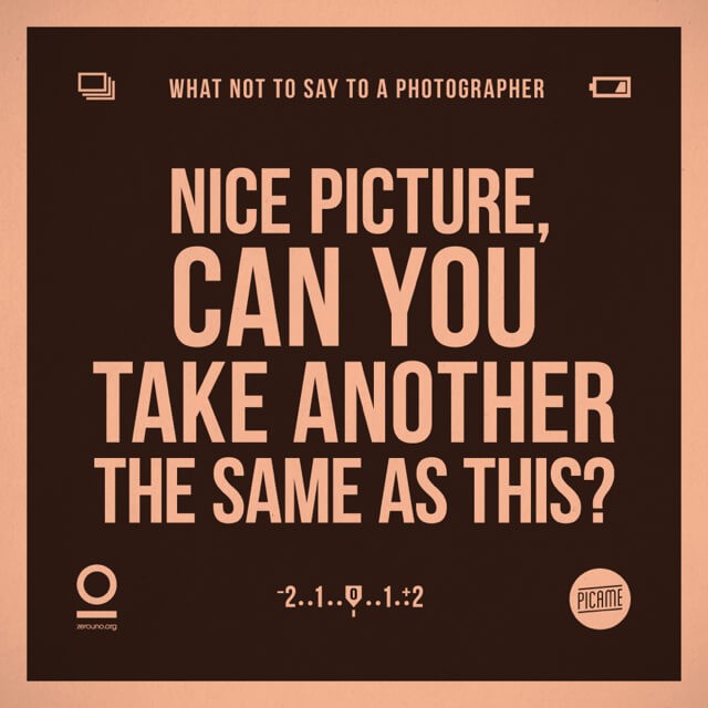 Si eres fotógrafo este post te hará recordar muchos momentos, se trata de una serie de carteles creados por el diseñador Italiano Luca Masini en colaboración con la revista Picame titulada: “What Not to Say to a Photographer” en español sería algo así como: “Que no debes decirle a un fotógrafo“, son un total de 13 carteles con frases que los fotógrafos odian escuchar de las personas, en particular tengo varios amigos fotógrafos a quienes he escuchado quejarse de frases muy similares.
