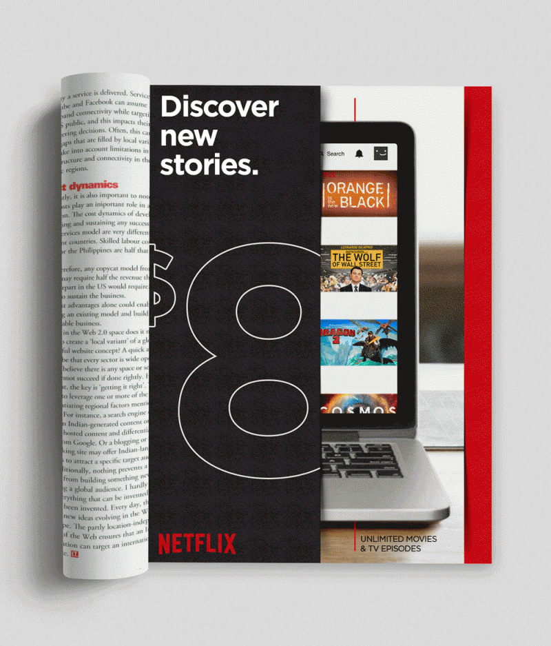 Netflix necesitaba un hilo conceptual y visual para conectar todo. Nuestro reto era crear algo lo suficientemente amplio para ser una marca global, pero que siga siendo único e identificable. Tenía que ser visualmente impactante, adaptarse a cualquier formato, y con capacidad para la interpretación de las agencias y proveedores de todo el mundo.
