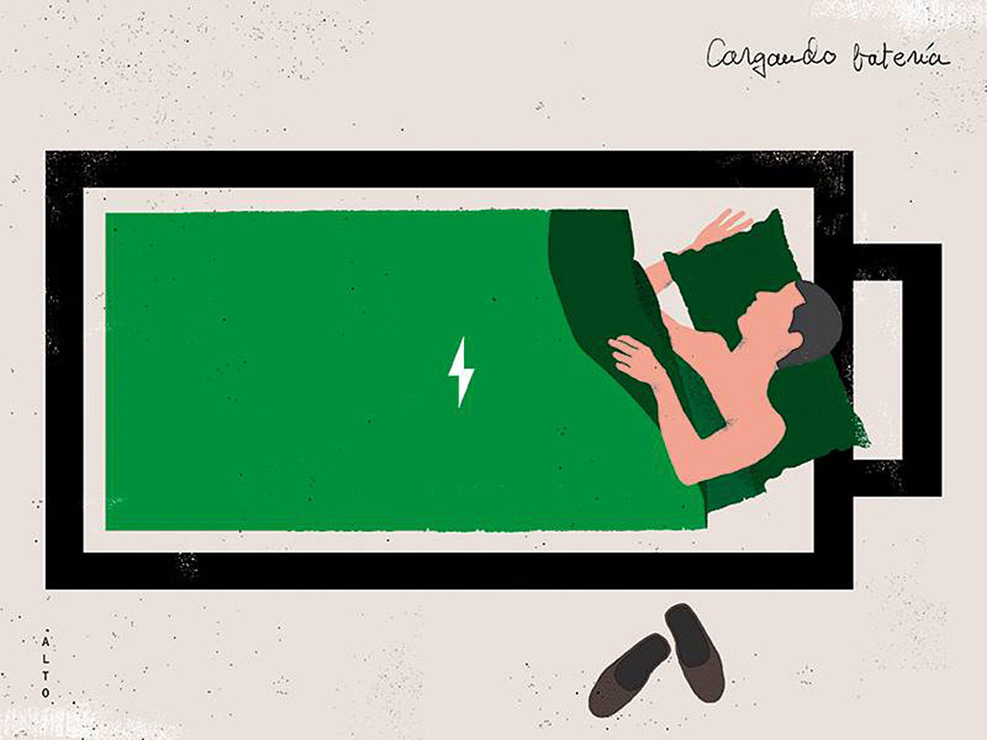 Esta viñeta nos muestra a un hombre que descansa en una cama en forma de bateria recargada; sin embargo en una interpretacion personal se puede entender que nuestros patrones de descanso estan por desgracia vinculados con los patrones de carga de nuestros dispositivos electronicos… raro ¿no?.