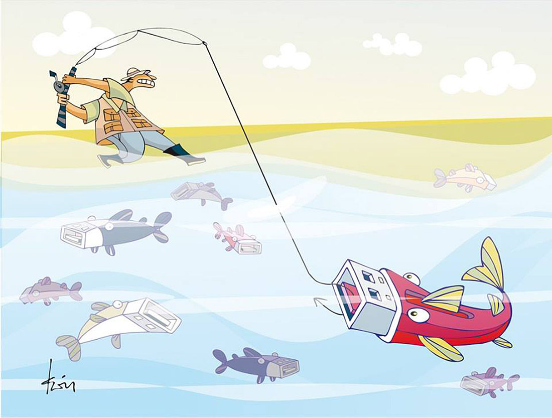A esta es difícil buscarle una interpretación pero se puede ver que es a un señor pescando algunos ejemplares marinos con forma de USB.
