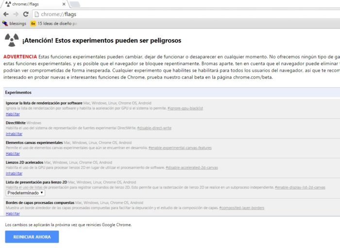 Por ultimo tendrás que ingresar en este link Chrome://flags desactivar una sola opción que en esta ocasión es la primera de la imagen de abajo y que dice “Ignorar la lista de renderización por software“; seleccionando la opción deshabilitar.