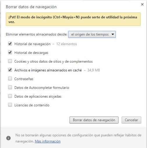 Este es muy sencillo; elimina todo tu historial de navegación siguiendo estos sencillos pasos ( Botón Menú > Historial y Borrar datos de navegación); inmediatamente te aparecerá la siguiente ventana donde lo recomendable es seleccionar todas, elegir la pestaña “El origen de los tiempos” y presiona el botón “Borrar datos de navegación“.