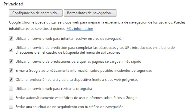 Aquí tendrás que desactivar las opciones “Utilizar un servicio web para intentar resolver errores de navegación” y “Enviar a Google automáticamente información sobre posibles incidentes de seguridad” que como saben ninguna de las opciones es útil y solo alenta el servicio del navegador al tener tareas pendientes.
