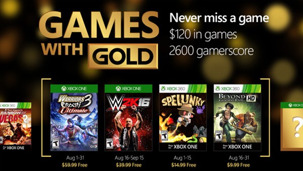 Como cada mes Microsoft le regala a sus usuarios un paquete de 4 juegos gratuitos; en esta ocasión para los usuarios que cuentan actualmente con una membresia Gold activa podrán descargar Warriors Orochi 3 Ultimate, W2k16, Spelunky, y Beyond: Good & Evil HD.