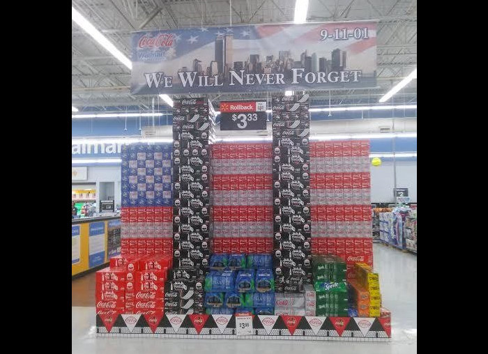 Este display implementado en una tienda Walmart ubicada en Florida fue co-protagonista de este escándalo en redes sociales al presuntamente aprobar este tipo de publicidad catalogada como “ofensiva“; la cual fue presentada bajo el eslogan “We Will Never Forget” seguida del precio de una caja de Coca-cola.