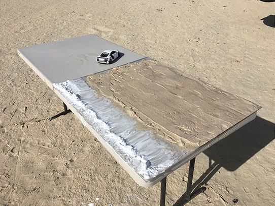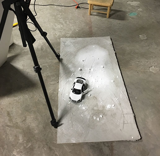 Este artista ha logrado ahorrar miles de dolares para el desarrollo de esta campaña; al utilizar un vehículo a escala que cuesta solamente $40 dolares en vez de uno original de $160,000; sin duda una manera creativa de tomar fotos por parte de este artista.