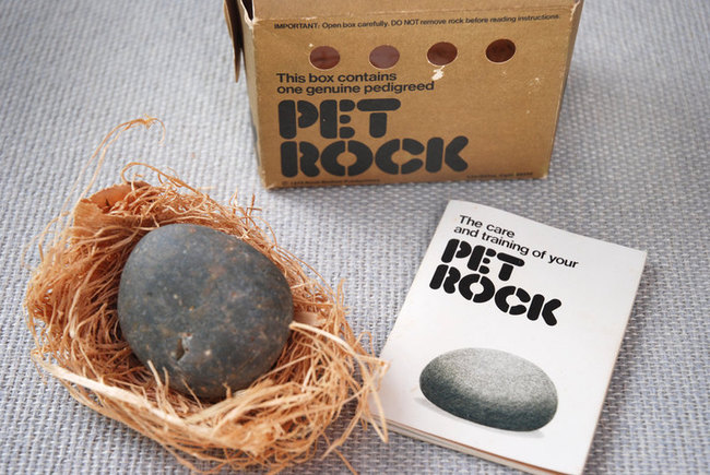 Así es lo increíble es que se sigan vendiendo aunque ahora con un packaging “mejorado”; ya que por $19.95 dolares aun puedes adquirir tu Pet Rock con todo y manual de cuidados y entrenamiento y ademas de un nido para que descanse… y por supuesto un certificado de autenticidad para que sepas que es una roca de raza pura.