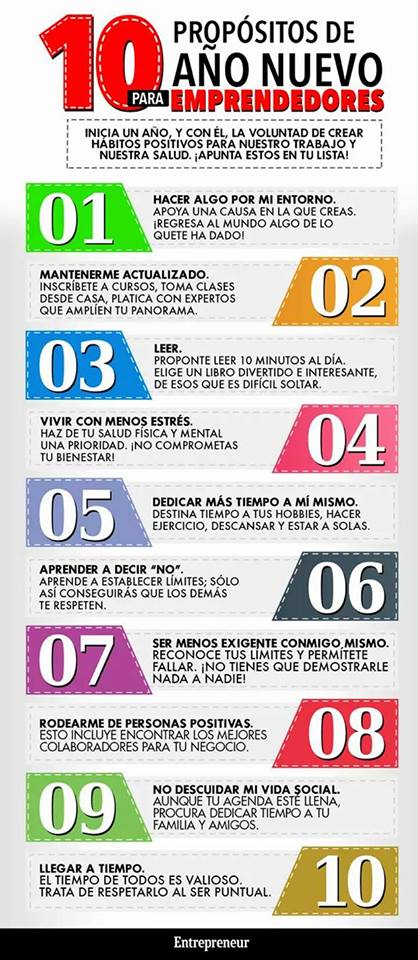 Razón por la cual comparto con ustedes esta infografía que contiene 10 propósitos de año nuevo para emprendedores; claro estos no solo se limitan a ellos si no que de igual manera pueden ser aplicados por todos los creativos.
