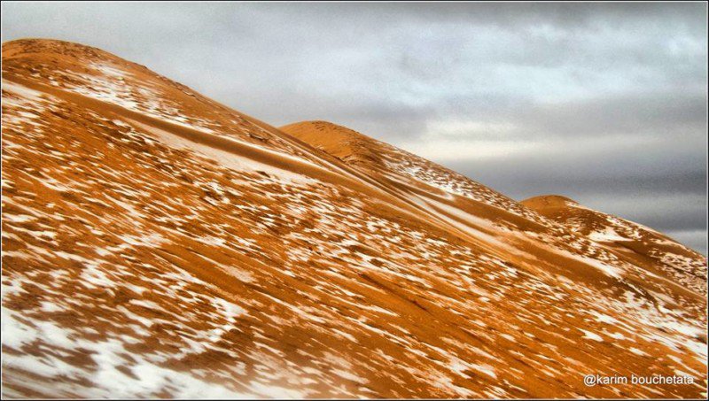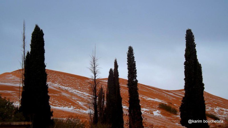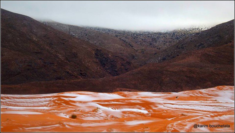 El fotógrafo Karim Bouchetata fue quien tomo estas increíbles fotografías; mismas donde podemos apreciar la belleza de este raro fenómeno que constituye la primera nevada en el sahara desde hace 37 años.