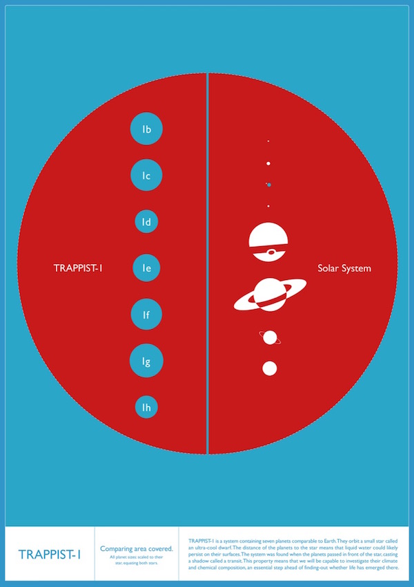 Estas ilustraciones con un toque minimalista nos permiten apreciar a escala es tamaño de los planetas que comprenden TRAPPIST-1 en comparación nuestro sistema solar.
