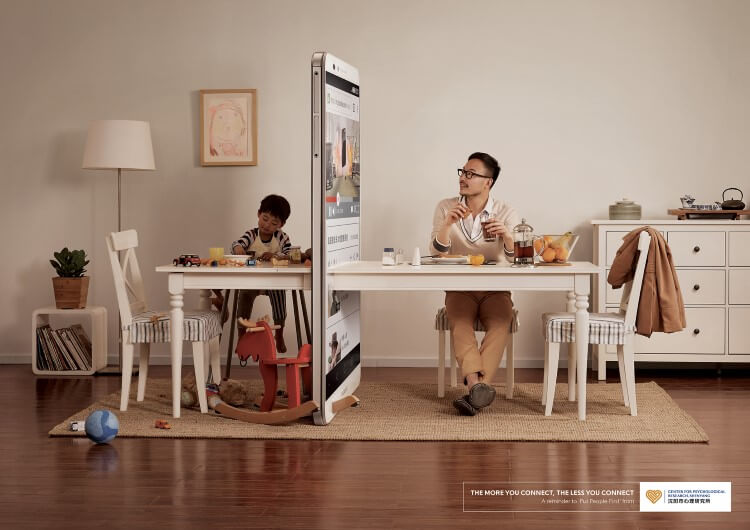 Phone Wall Campaign, es el nombre de una campaña que si bien no es actual refleja la realidad de la conexión entre las personas debido a la expansión de la tecnología. La campaña impresa fue realizada por la agencia de publicidad Ogilvy Beijing para el Centro de Investigación Psicológica de Shenyang, China, esta campaña fue publicada en Abril de 2015 y el proyecto estuvo a cargo del director creativo Donghai Liu.