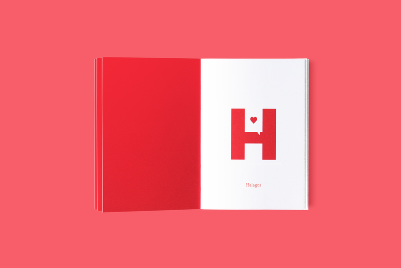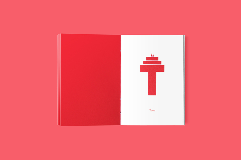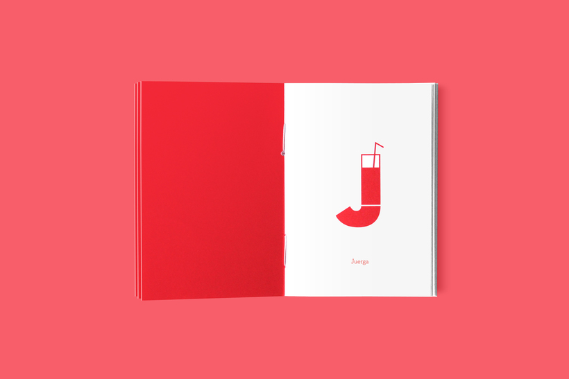 Este genial diseño de invitación es realizado en forma de libro, el cual, en cada una de sus paginas contiene una letra del alfabeto; las cuales, contienen cada una elementos que estuvieron disponibles en la boda de estos diseñadores; dando como ejemplo las letras C que representa comida y la J que representa la Juerga o la fiesta.