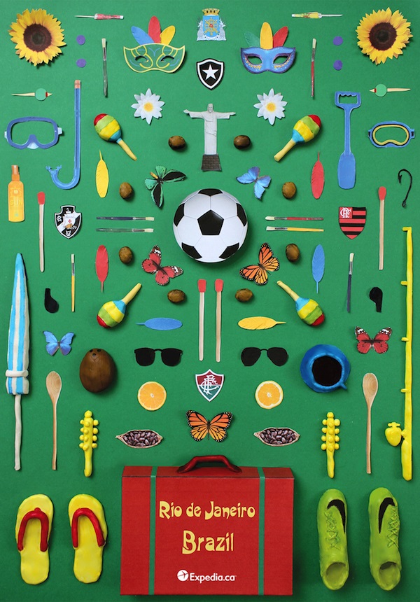 Estos posters nos muestran elementos que caracterizan Brasil, Paris, Tokio y Estados Unidos; cabe señalar que estas representaciones se han realizado con cerca de 300 objetos situados en estas fotografías y representan un viaje a 4 países de 4 continentes distintos.