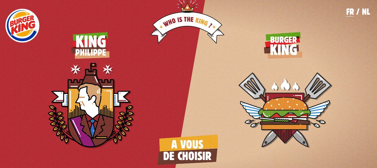 Tal es el caso de la reciente campaña de Burger King denominada “Who is the King?“; la cual, tiene como fin celebrar la apertura del primer restaurante de la marca en Bélgica; donde gobierna el rey Felipe de Sajonia-Coburgo-Gotha y Ruffo di Calabria.