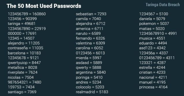 Taringa, una red social originaria de Argentina fue víctima de un hackeo hace casi un mes; en el que se filtraron poco más de 28 millones de contraseñas, las cuales, dejan mucho que desear sobre la creatividad de sus usuarios para la creación de contraseñas de seguridad.