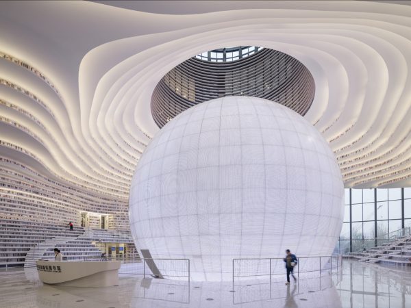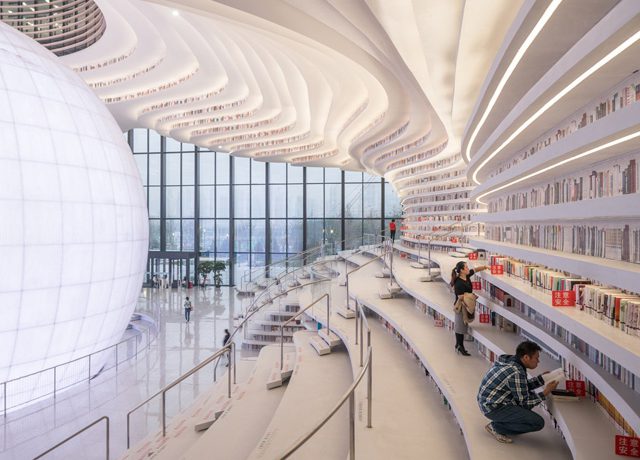 Desgraciadamente estos no se encuentran disponibles para todo público, no obstante, podemos observarlos, admirarlos e inspirarnos de ellos; lo mismo haremos con este diseño arquitectónico espectacular de una biblioteca futurista ubicada en Binhai, China, la cual, ademàs de su espectacular diseño tiene un increíble número de libros (1.2 millones) disponibles repartidos en sus estructuras curvas.