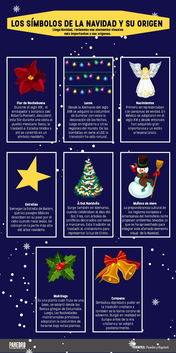 Es por ello, que les traemos una infografía creada por el sitio web Paredro; la cual contiene algunos de los elementos más representativos de la navidad así como una breve explicación de su origen, que nos puede servir como tema de conversación y cultura general.
