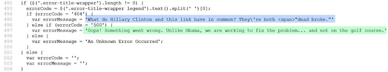 “¡Vaya! Algo salió mal. A diferencia de Obama, estamos trabajando para solucionar el problema … y no en el campo de golf ” y “¿Qué tienen Hillary Clinton y este enlace en común? Ambos están en la quiebra total “; son los mensajes que contenian el código del sitio en cuestión, ya que tan pronto comenzo a circular por las redes, estos mensajes fueron eliminados del sitio.