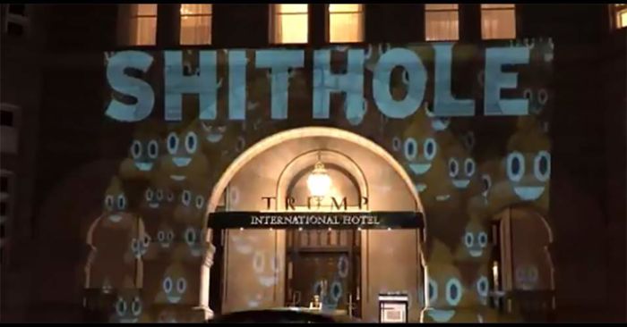Esto lo demuestra la artista Robin Bell; quien ha proyectado a manera de manifestación la palabra “Shithole” con emojis de popo, una proyección literal de lo que presuntamente ha declarado Donald Trump.