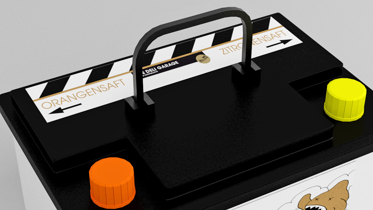 Un empaque que contiene una bebida de limón de la marca “The Deli Garage DoppelSäure” con forma de batería de auto.