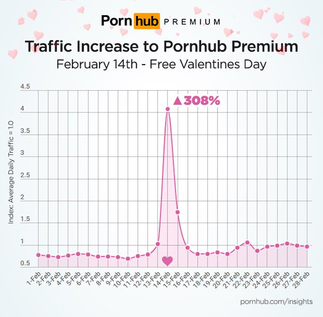 Para ello, ha decidido regalar algo que sus usuarios más asiduos valorarán, se trata de su servicio Premium de vídeos y películas para adultos, el cual estará gratis durante este 14 de febrero, esto debido a que según la empresa el 14 de febrero del 2017 el tráfico en su sitio web tuvo un abrupto aumento; tal como lo muestra en esta grafica.