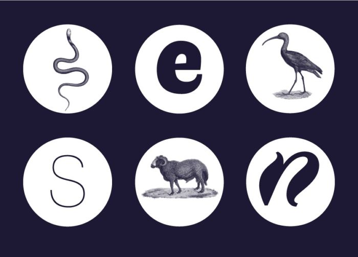 “A partir de tres clases de animales vertebrados: reptiles, mamíferos y pájaros, se imaginó tres caracteres tipográficos, creando las bases de una familia heteróclita” señala AliceSavoie