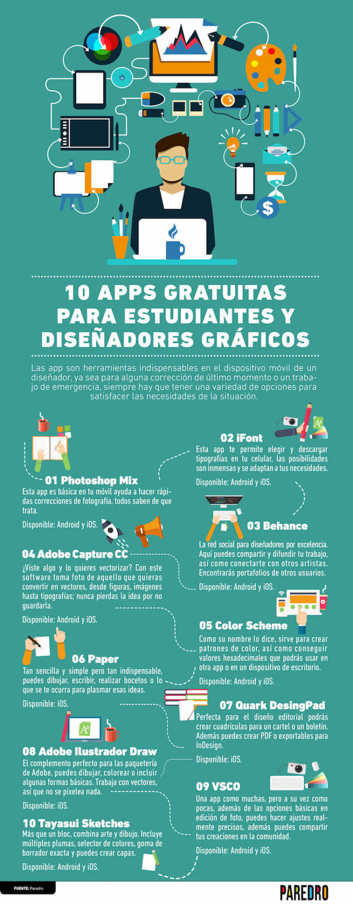 Dando una vuelta por el sitio web Paredro; nos hemos topado con una infografía bastante interesante, la cual, nos comparte 10 aplicaciones gratuitas ideales para estudiantes y diseñadores gráficos.