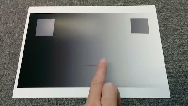 Y es que esta demostración consta de un papel impreso con un degradado en blanco y negro junto con tres muestras pequeñas e idénticas en gris, muestra cómo una de las hojas más pequeñas “cambia” a la sombra cuando se desliza a través del degradado.